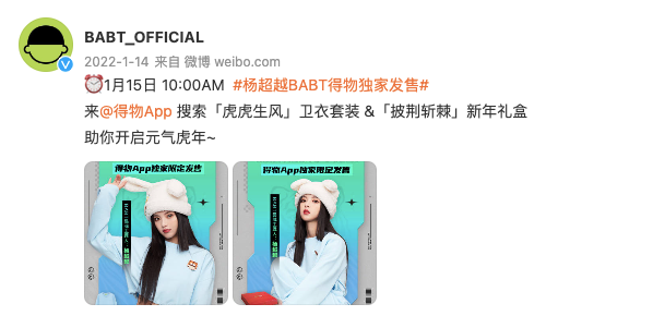 去年,王鶴棣在其生日當天推出D_DESIRABLE,也是在因《蒼蘭訣》大火之后。楊超越主理潮牌BABT是在2020年10月面世,同年6月,她所在的火箭少女101限定團正式解散,并開始成立個人工作室發(fā)展個人業(yè)務(wù)。