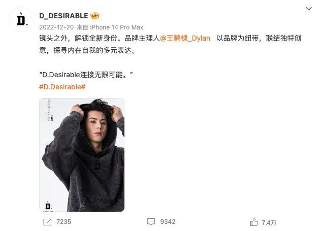近些年,尤以流量明星為代表,入局做潮牌成為趨勢。如楊超越的BABT,黃明昊的TWOEX2,以及去年因《蒼蘭訣》大火的王鶴棣,也推出了個人潮牌D_DESIRABLE。