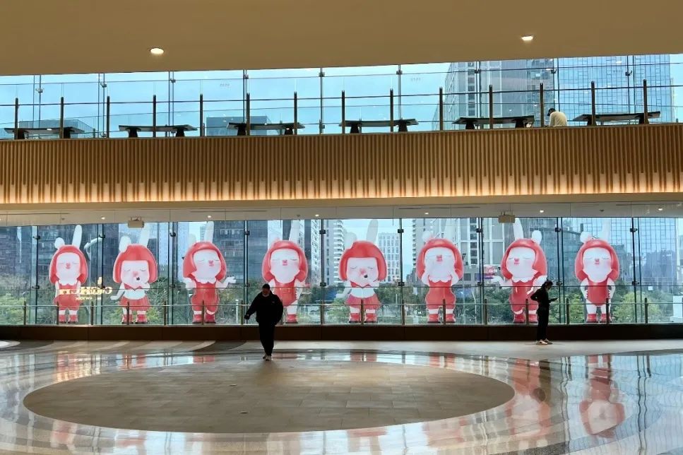 IP藝術(shù)裝置展覽期間,不僅微信公眾號活動推文的配圖,會出現(xiàn)相關(guān)元素和配色。商場外部、大門、玻璃窗處及商場內(nèi)部宣傳欄也都更換成同主題的裝飾,給每個進(jìn)入商城的顧客帶來完整統(tǒng)一的沉浸式氛圍感。