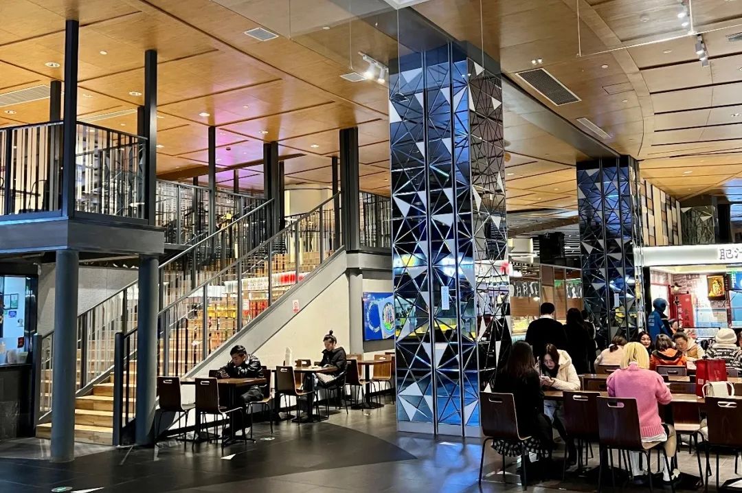 F5餐廳一側(cè)為高端商務(wù)餐飲品牌,中間為各地特色美食,另一側(cè)為Food Hall日式主題餐飲區(qū)。同樣具有極強(qiáng)的包容性,而裝修也從一側(cè)的暗調(diào)高冷向明亮溫暖漸變,為不同品類營造合適的氛圍。