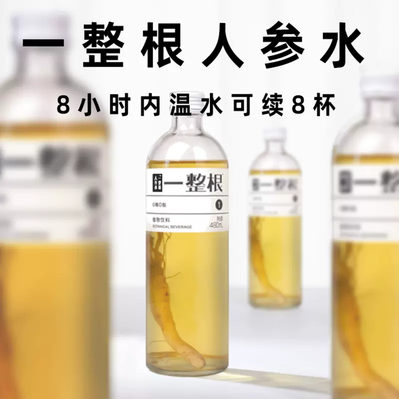 “一整根”罕見的將人參整根用于即飲飲料中,透明的玻璃瓶包裝將整根人參完整的展示出來,給人強(qiáng)烈的養(yǎng)生體驗感。在產(chǎn)品宣傳上,“一整根”以熬夜水自稱,并標(biāo)注著可續(xù)8杯溫水的使用方法,加重的泡人參茶的概念。