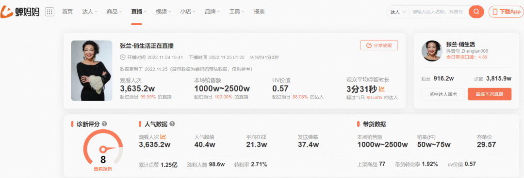 2022年11月24日,張?zhí)m直播數(shù)據(jù),來源:蟬媽媽