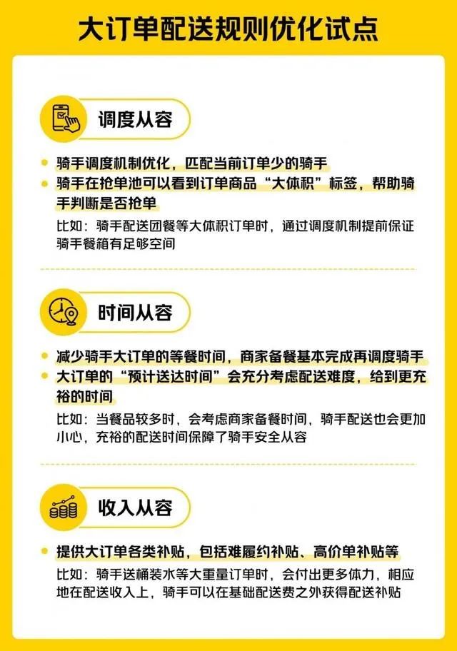 上個(gè)月,美團(tuán)配送宣布大物件訂單優(yōu)化舉措,針對(duì)鮮花、美妝、手機(jī)等“大體積、大重量、高價(jià)格”的訂單分別優(yōu)化配送規(guī)則,