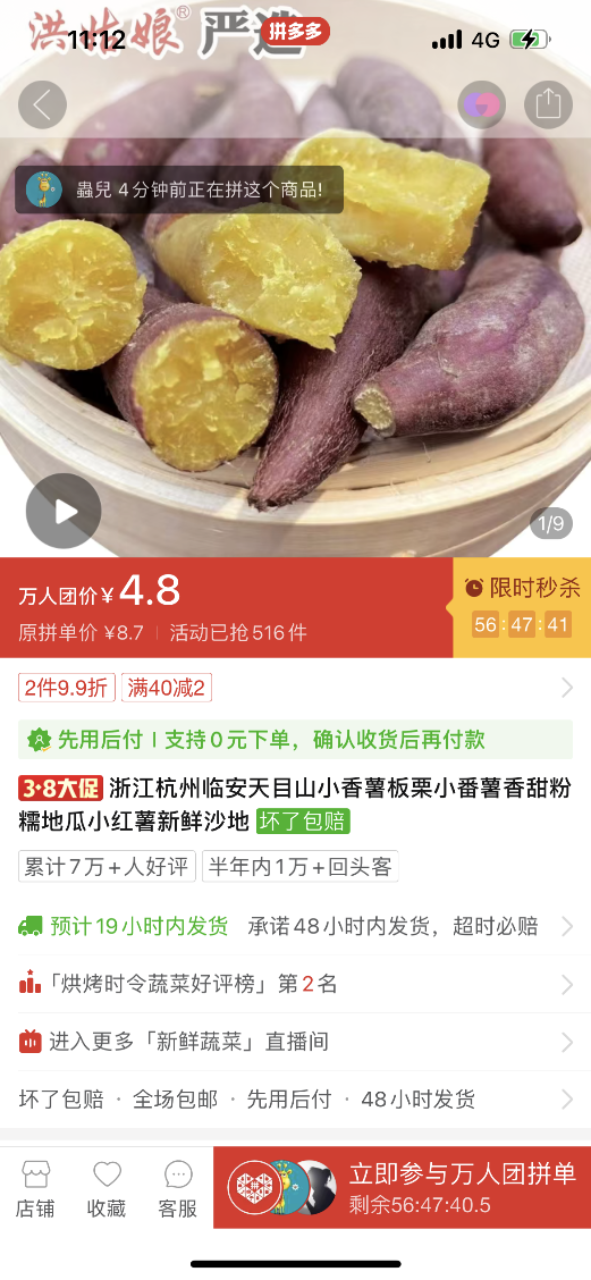 打開了銷路之后,洪嬌更加注重了小香薯的品質(zhì),從當(dāng)?shù)刂T多供應(yīng)商中挑出了4家專為拼多多的用戶供貨。