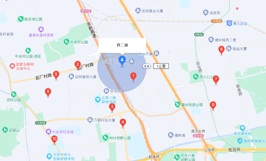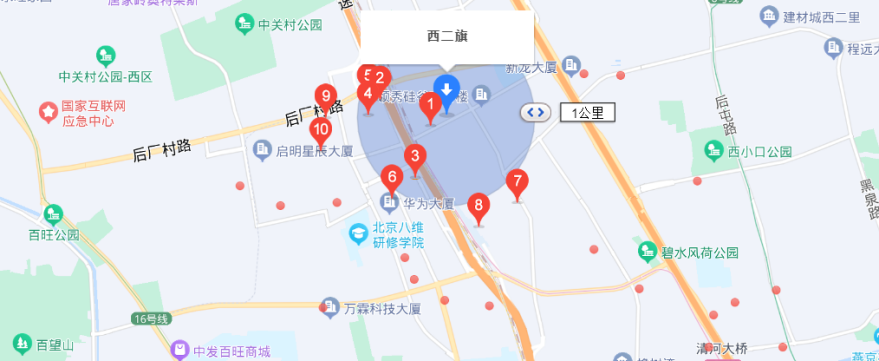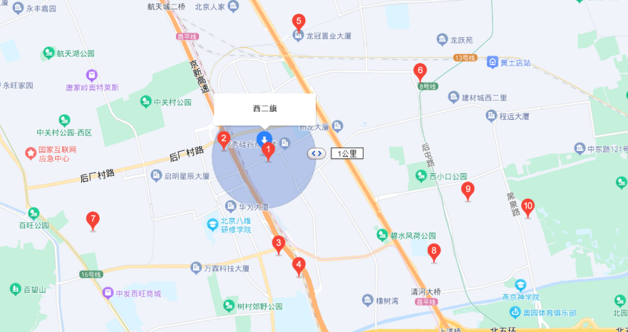 望京之外,作為互聯(lián)網(wǎng)企業(yè)聚集的西二旗,門(mén)店數(shù)量最高的是便利蜂(注:地圖上未標(biāo)注數(shù)字的紅色圓點(diǎn)也代表一間便利店),羅森門(mén)店數(shù)量與7-11基本上持平。