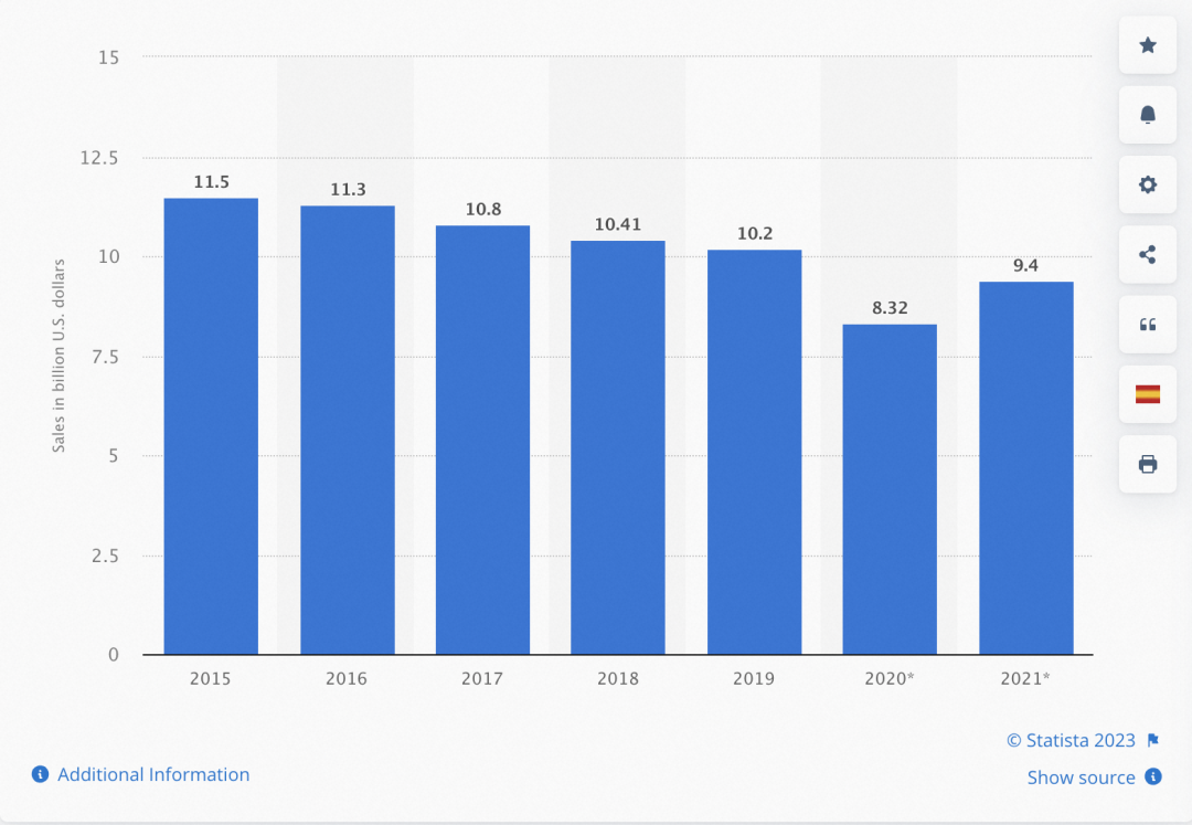 折價(jià)出售,在于業(yè)績短暫回暖,但不確定性更多。賽百味經(jīng)歷了漫長的衰退期,創(chuàng)始人Fred DeLuca逝世后的2016年,賽百味在美國閉店數(shù)首次超過新開門店數(shù);2018年和2019年,賽百味在全球關(guān)店數(shù)超過了1000家。銷售額上,據(jù)國外數(shù)據(jù)平臺(tái)statista監(jiān)測,賽百味在美國本土市場的銷售額自2015年的115億美元開始,一路下滑至2020年的83.2億美元。2021年反彈至94億美元,2022年最新數(shù)據(jù)為104億美元。