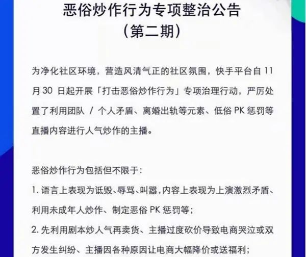 往近了說(shuō),今年2月14日快手發(fā)布了“惡俗炒作”處罰公告,明確禁止以虛構(gòu)劇情進(jìn)行虛假營(yíng)銷或兜售虛假產(chǎn)品?梢钥吹剑焓謱(duì)待這些投機(jī)取巧的主播并沒(méi)有手軟。