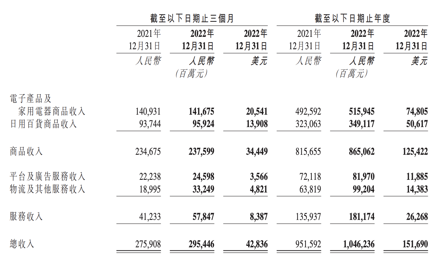 去年Q4,京東的商品收入僅同比增加1.2%。具體來看,電子產(chǎn)品及家用電器收入1416.8億,同比僅增長0.5%,因為iPhone 14 發(fā)布以及極端高溫天氣的加成,京東在此項上曾在三季度迎來反彈,但這樣的趨勢沒能延續(xù);在感染期間更為剛需的日用百貨商品收入959.2億,同比增長2.3%。