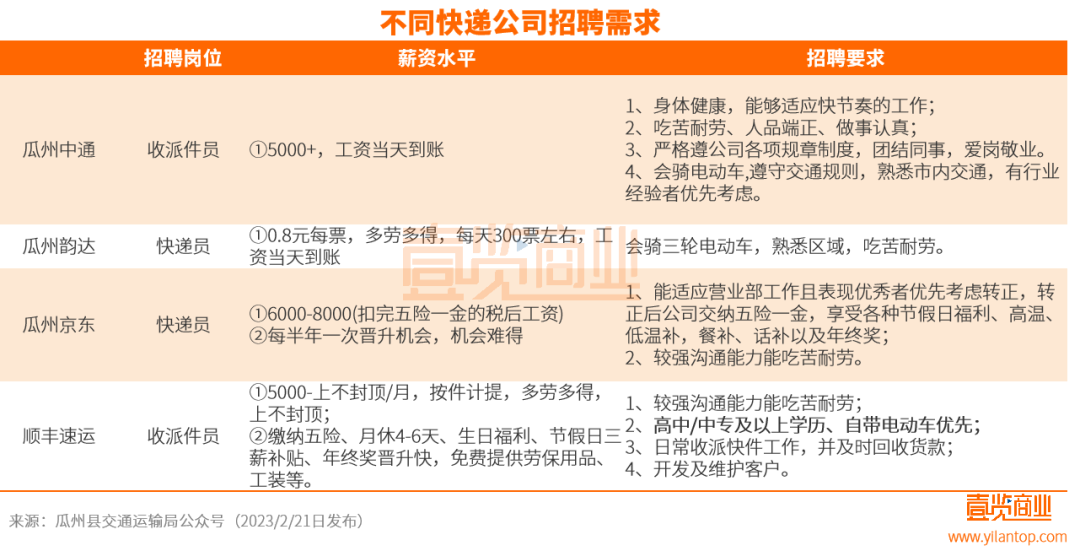 以甘肅省酒泉市瓜州縣為例,該地同時發(fā)布的4家快遞公司的招聘顯示,京東和順豐的招聘要求明顯高于中通和韻達,當然待遇也更好。順豐甚至對學(xué)歷也有要求,需要是高中及以上。