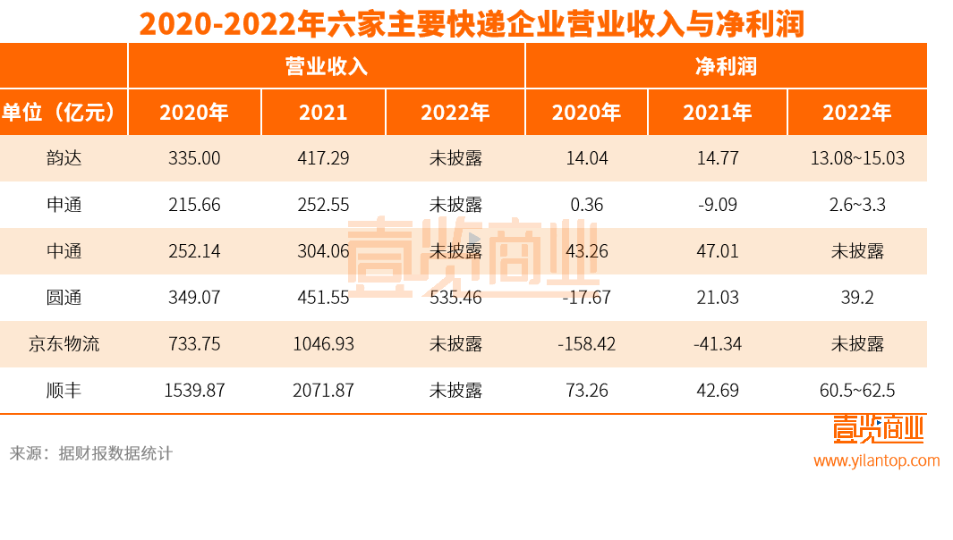 此外,據(jù)韻達發(fā)布的2022年業(yè)績預(yù)告,2022全年業(yè)務(wù)量176.09億票,同比下降4.31%。凈利潤預(yù)計為13.08~15.03億元之間,同比下降11.44%~同比增長1.76%。