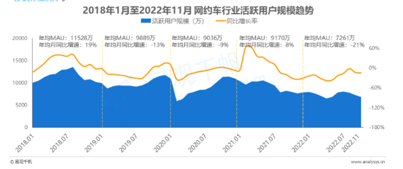 根據(jù)易觀數(shù)據(jù)分析,當(dāng)前中國(guó)網(wǎng)約車行業(yè)月活躍用戶規(guī)模日趨見(jiàn)頂,2022年的1-11月,活躍用戶的規(guī)模和同比增長(zhǎng)率都處于小幅下降階段,市場(chǎng)已經(jīng)轉(zhuǎn)入存量競(jìng)爭(zhēng),行業(yè)集中度或進(jìn)一步提升。