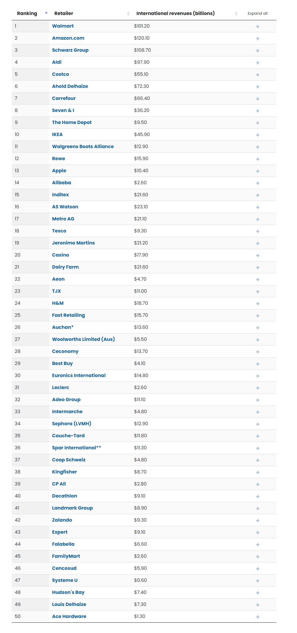 《全球零售商50強》是對全球最具影響力的50家零售商的全新審視,基于它們從2022年開始的運營情況。為了最大限度地減少貨幣匯率和美國本土市場優(yōu)勢等因素的影響,Kantar的零售商數(shù)據(jù)庫基于零售商所在地的貨幣計算,該貨幣會根據(jù)國際貨幣基金組織匯率數(shù)據(jù)庫轉(zhuǎn)換為美元,以此來排名。同時,Kantar的排名依據(jù)零售商的國內(nèi)和國際零售收入為其打分,參評零售商需要在至少三個國家進行直接投資。