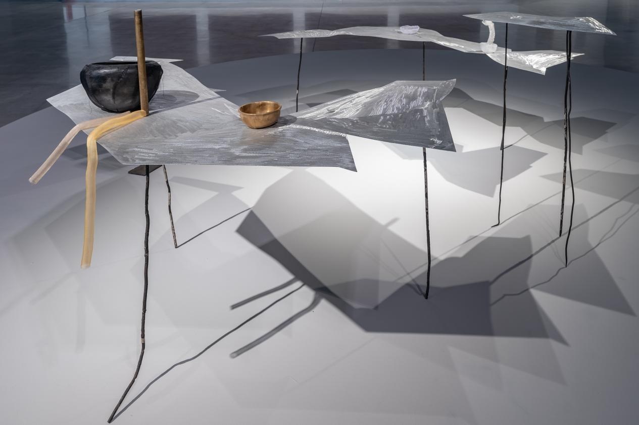 從某種意義上來說,劉月的《起源》,以物理學(xué)的形態(tài),重新將時間拉回到宇宙的尺度。而陳哲的特定場地裝置《夜空中的最后?程》,卷軸般的形式出發(fā),同樣是在超越人類生命時間的尺度中,去識別、連通生命的普遍經(jīng)驗。在沈心怡的《洋蔥大師》中,生命展現(xiàn)出一種徒勞的自我娛樂;與之對應(yīng)的,王梓全的委任創(chuàng)作《瞬息,呼吸的存儲器》,將亙古的生命欲望轉(zhuǎn)化為一種想象未來的技術(shù)動力,通過環(huán)繞大廳的軌道,串聯(lián)起“星象魔法”的時空之旅。
