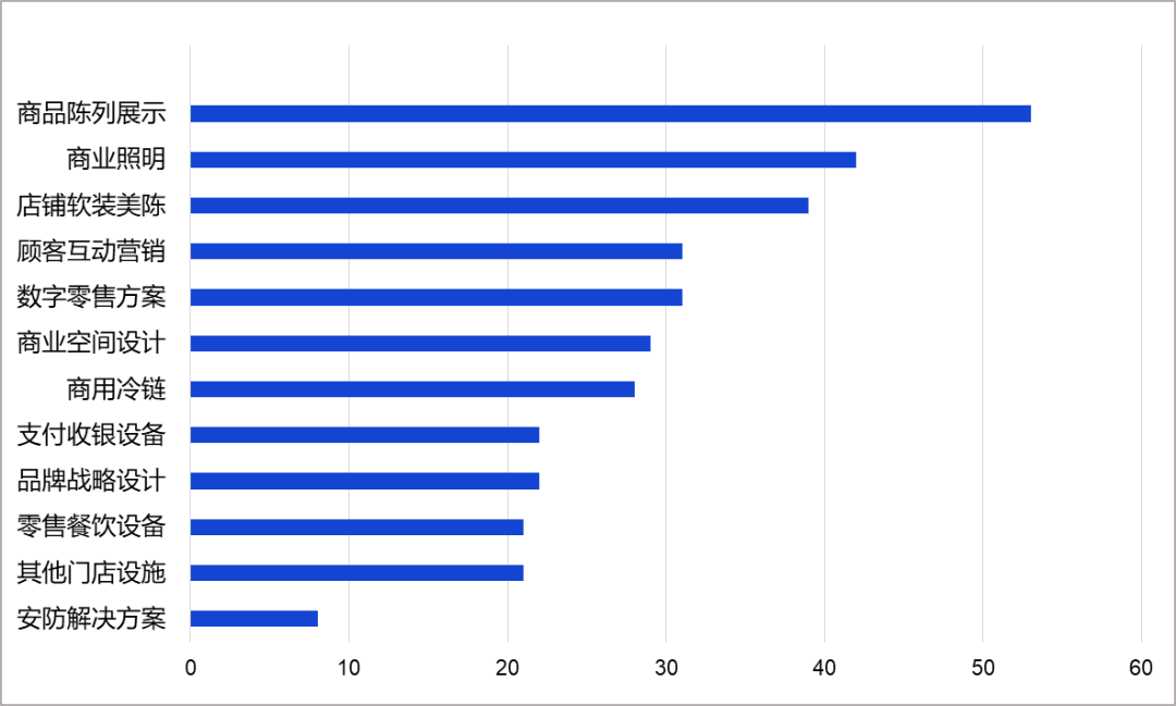 而在具體改造對(duì)象上,商品陳列展示、商業(yè)照明、店鋪軟裝美陳是位列前三需求,另外,顧客互動(dòng)營(yíng)銷、引入數(shù)字零售方案、優(yōu)化商業(yè)空間設(shè)計(jì)也是企業(yè)舊店改的重要對(duì)象。