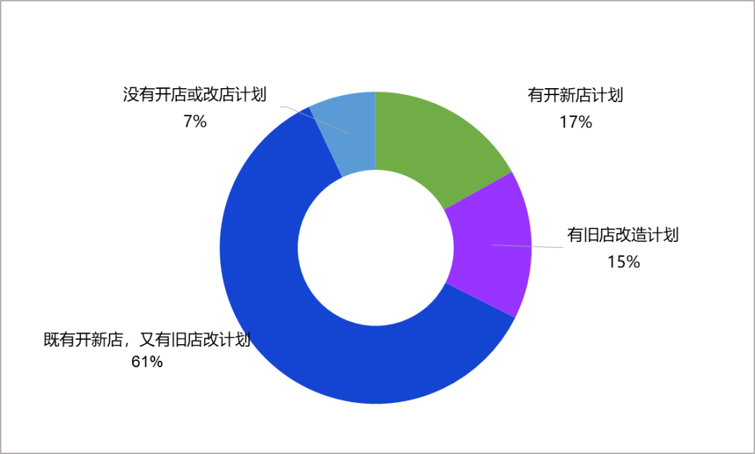 93%的受訪企業(yè)表示2023年有新開店或舊店改造計(jì)劃,其中超過60%的企業(yè)既有開新店計(jì)劃,也有舊店升級(jí)改造的打算,對(duì)2023年的發(fā)展保持積極信心,還有17%的企業(yè)以開新店為主,15%的企業(yè)以舊店升級(jí)改造為主。