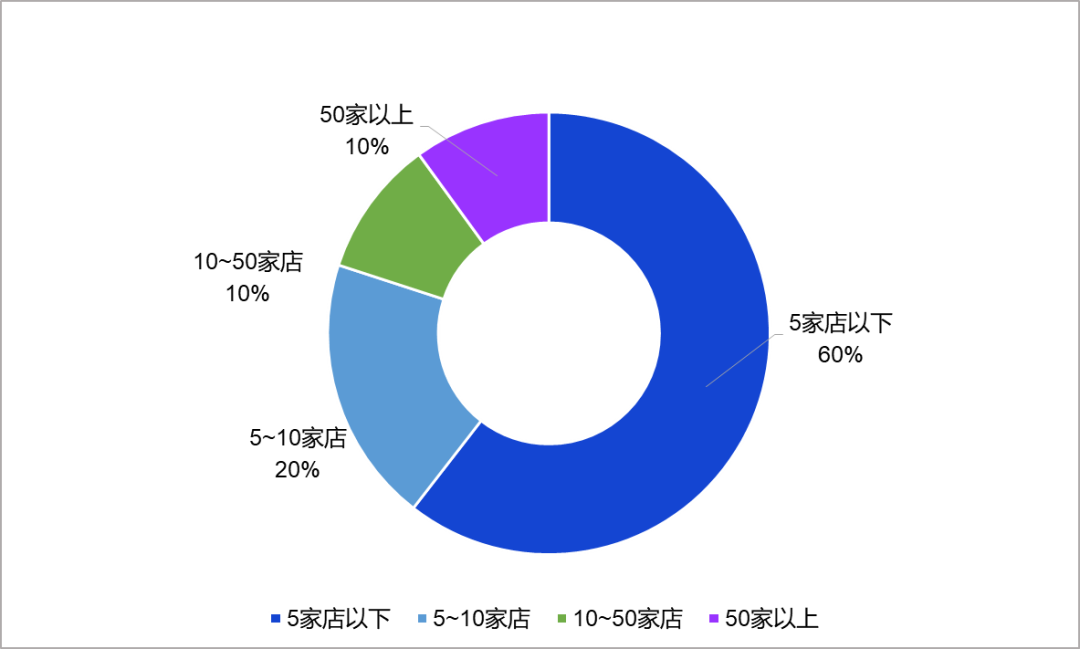 有54家企業(yè)門店數(shù)量在1~50家區(qū)間,5家企業(yè)在50~100區(qū)間,10家企業(yè)在100~500區(qū)間,2家企業(yè)門店數(shù)在500家以上。