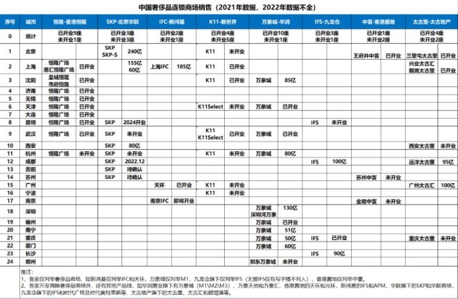 2、截至2022年12月,已開業(yè)重奢侈商場7大巨頭(SKP、萬象城、恒隆、新鴻基、太古、九龍倉、香港置地)就達到36家。其中疫情三年,恒隆、太古里、SKP各開業(yè)一家,華潤置地更是在2022年就開出武漢、福州、長沙三家萬象城(M1)。