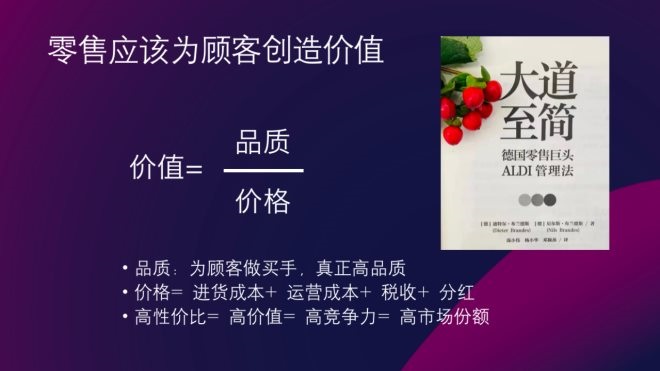那么究竟如何將商品價(jià)格降低?龐總以ALDI作為例子給大家進(jìn)行了講述,首先對(duì)SKU極其克制,第二個(gè)就是即刻降價(jià),一旦進(jìn)貨價(jià)格降低,就立馬降低商品價(jià)格,做到完全透明。第三是放棄位置,選擇租金低的地方開店。第四是放棄貨架,貨架需要錢,所以直接選擇將貨堆到地板上。