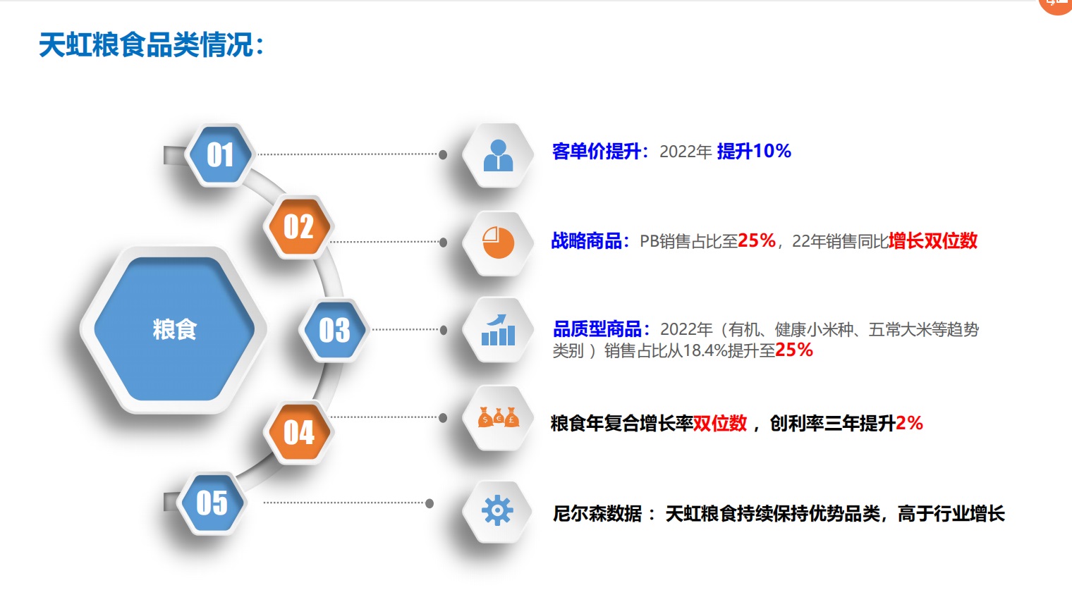 1、大單品的打造。大單品其實(shí)是提升品牌業(yè)績(jī)很好的一種方式。2022年公司17個(gè)大單品項(xiàng)目中,提前達(dá)成全年目標(biāo),標(biāo)品中:五常米NO.1, 復(fù)購率50%+,天虹的標(biāo)桿口碑商品。