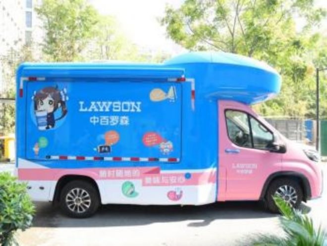 移動販賣車以“櫻花粉”和“羅森藍(lán)”為主色調(diào),采用羅森自有IP億億醬在內(nèi)的多個卡通形象裝飾車身