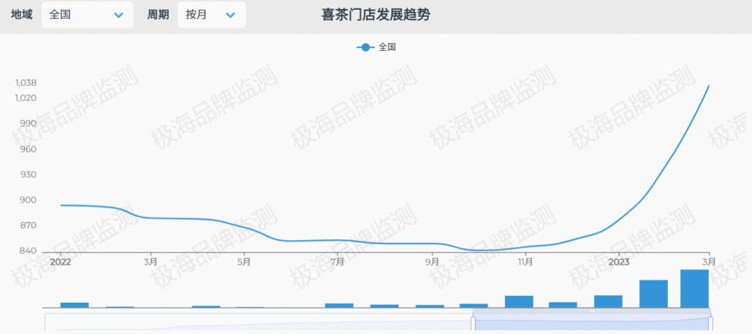 擴(kuò)店速度變快,門店變小,不難看出,喜茶想要快速在下沉市場(chǎng)開展自己的生意:極海品牌監(jiān)測(cè)數(shù)據(jù)顯示,喜茶在2022年12月17日—2023年3月17日這90天開設(shè)了200家門店,而在2022年全年,喜茶新增的門店數(shù)量不過93家。