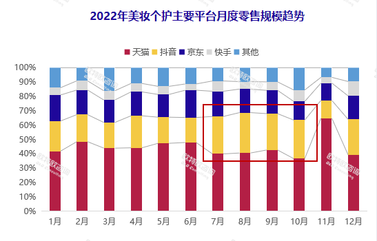 從渠道來看,天貓仍為美妝主戰(zhàn)場,2022年1-7月零售額占比接近50%。抖音則成為2022年最大的增量場,占比達21.5%,同比提升5個百分點!皬7月開始,抖音占比出現了大幅增長。”