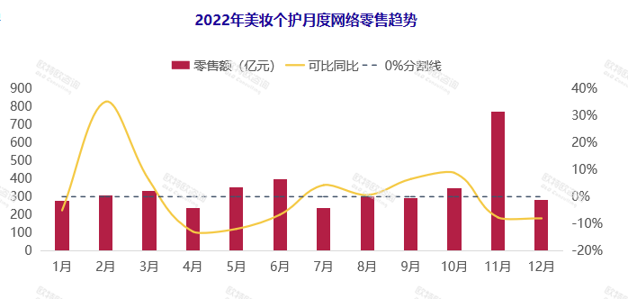 羅興總結年度監(jiān)測數據指出,2022年美妝個護線上同比下滑1.5%,銷售額在全網份額占比9.5%,排名第四,次于服裝服飾、家用電器品類。
