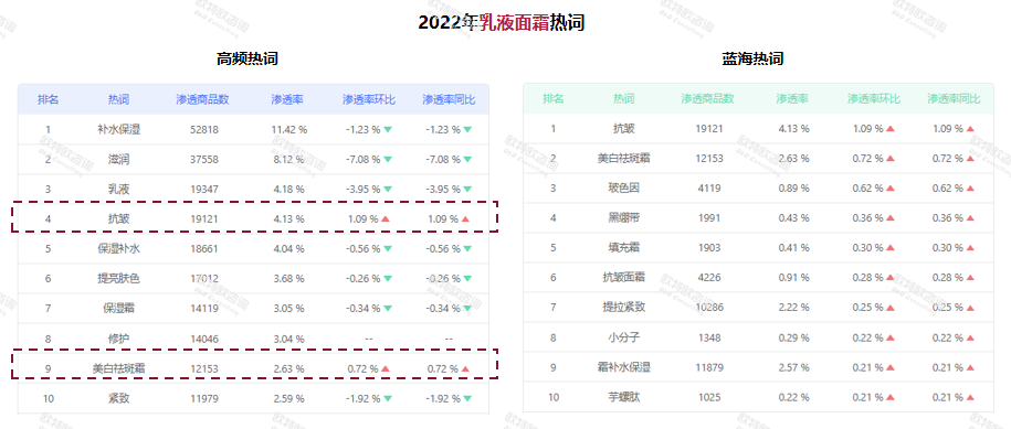 從消費者端來看,補水保濕、提亮膚色仍為面部精華產品的重點需求,滲透商品數和滲透率也位于前排。與此同時,次拋精華液、次拋等藍海詞匯滲透率也在逐漸上升!熬A油這種新產品形態(tài)增長較好,可能會是未來的一個增長契機!绷_興認為。