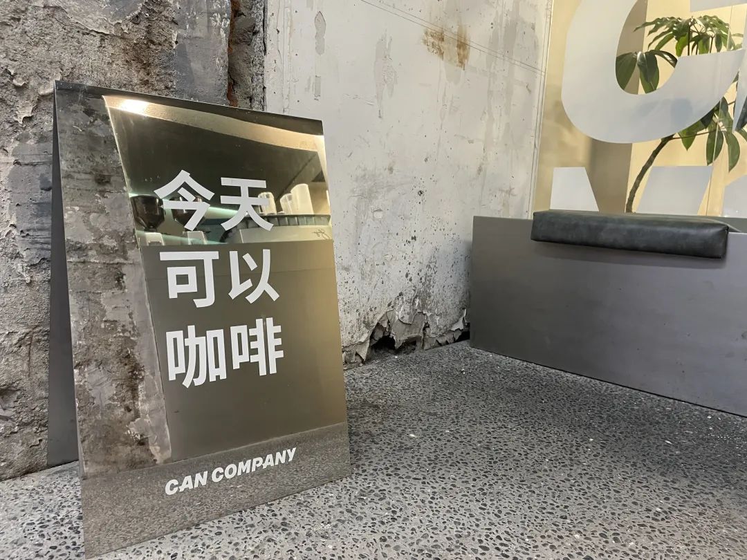 銀色鏡面落地立牌擺在店門口,與金屬感強烈的門店相呼應,風格強烈,立牌上的標語“今天可以咖啡”也很契合年輕人的審美。