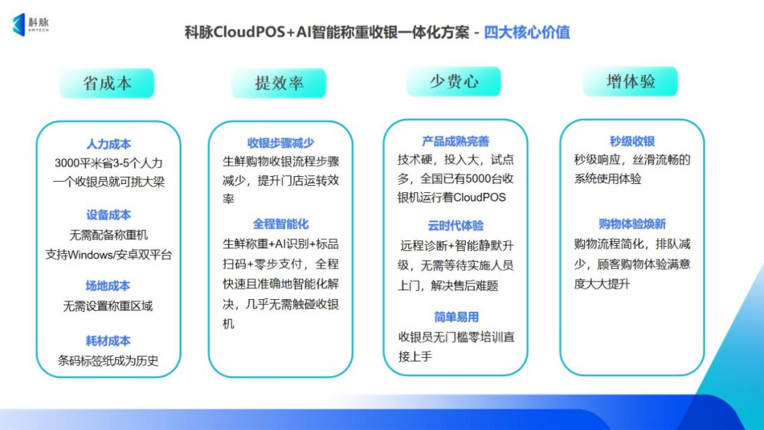 科脈CloudPOS+AI智能稱重收銀一體化方案對(duì)生鮮門店來說,有著四個(gè)最質(zhì)樸但卻最核心的價(jià)值:省成本、提效率、少費(fèi)心、增體驗(yàn)。