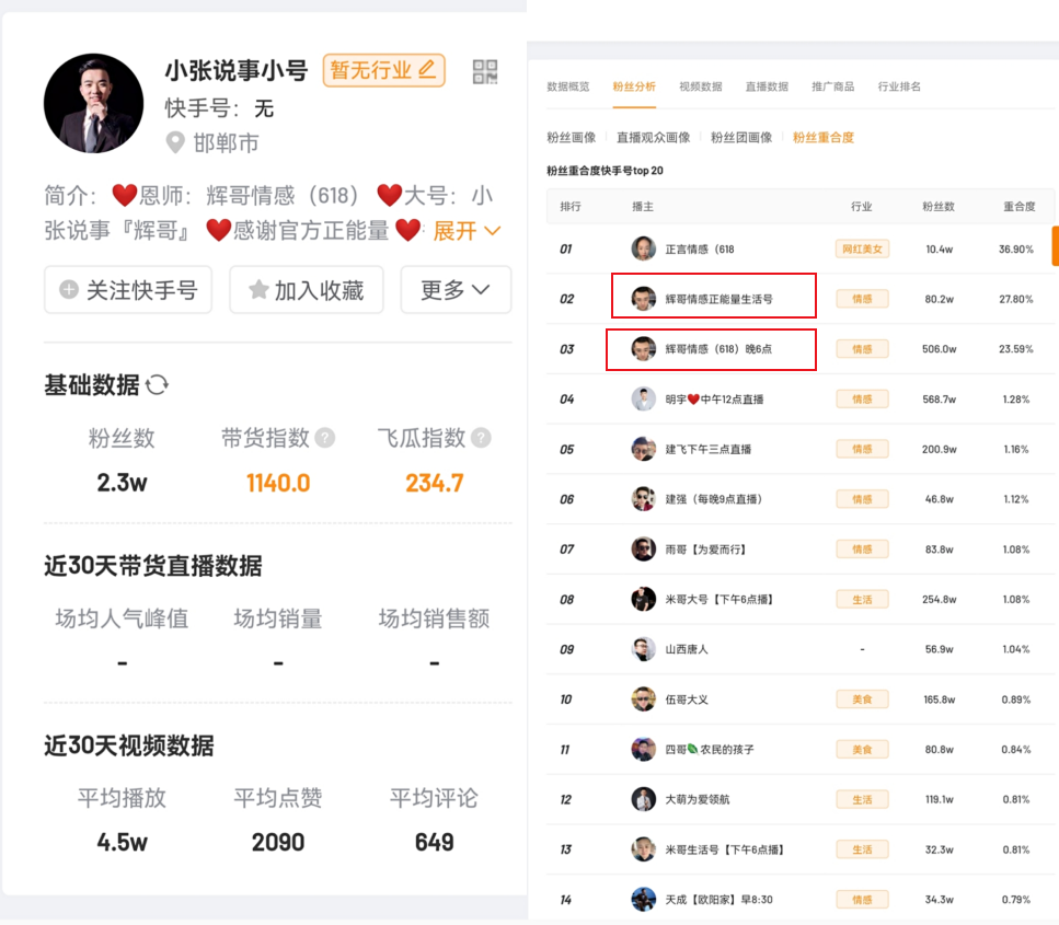 在短視頻平臺(tái)擁有超過2000萬粉絲的主播“高冷z”,最后一條短視頻停留在3月4日。近30天內(nèi),他發(fā)布了10條短視頻,平均播放量達(dá)到67.7萬;“小張說事”的大號(hào)已經(jīng)搜索不到,但一個(gè)名為“小張說事小號(hào)”的賬號(hào)粉絲數(shù)顯示已經(jīng)達(dá)到2.3萬,該號(hào)和“輝哥情感正能量生活號(hào)”“輝哥情感(618)”的粉絲高度重合,而輝哥正是小張的師傅。從封號(hào)時(shí)間來看,輝哥的一個(gè)賬號(hào)在2月28日停更,另一個(gè)在3月12日左右被封禁,均臨近3·15晚會(huì)。