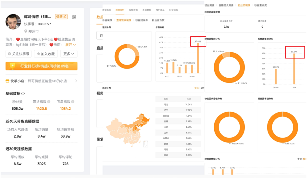這些賬號(hào)的特征明顯:1.粉絲年齡以40歲以上居多;2.粉絲黏性強(qiáng),粉絲團(tuán)數(shù)量龐大(粉絲團(tuán)指忠實(shí)粉絲,花錢才能成為粉絲團(tuán)一員);3.售賣的產(chǎn)品普遍客單價(jià)較低。