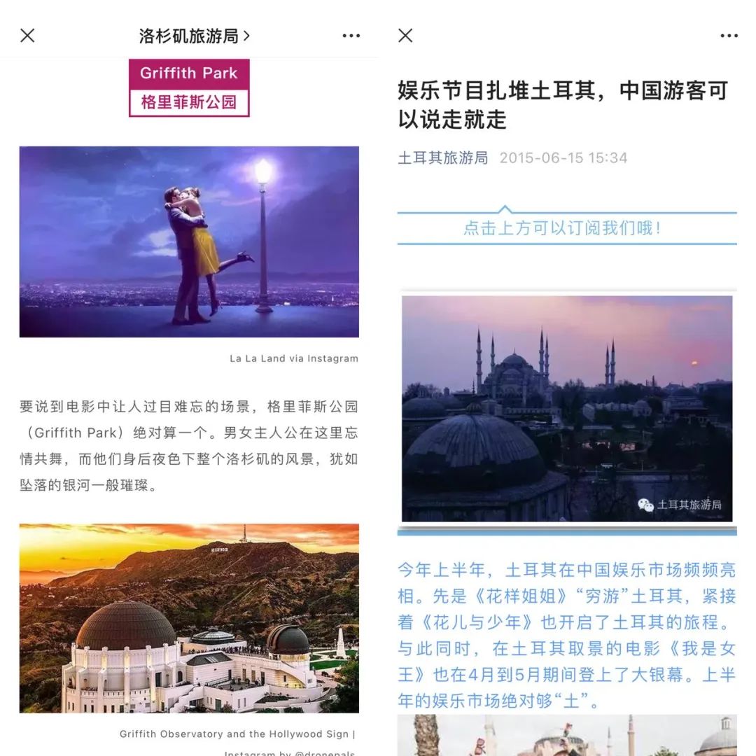 比如《愛(ài)樂(lè)之城》在國(guó)內(nèi)上映時(shí),帶動(dòng)了拍攝地洛杉磯的熱度。洛杉磯旅游局很快在微信推出《探索“愛(ài)樂(lè)之城”》專(zhuān)題內(nèi)容,并組織媒體、旅行社、OTA等旅游業(yè)者參與觀(guān)影會(huì)。此前《花兒與少年》《花樣姐姐》等大熱旅行綜藝中高頻出現(xiàn)目的地是土耳其,土耳其旅游局也借勢(shì)在社交平臺(tái)做推廣,對(duì)節(jié)目中出現(xiàn)的景點(diǎn)做更詳細(xì)介紹,進(jìn)一步加深用戶(hù)印象。