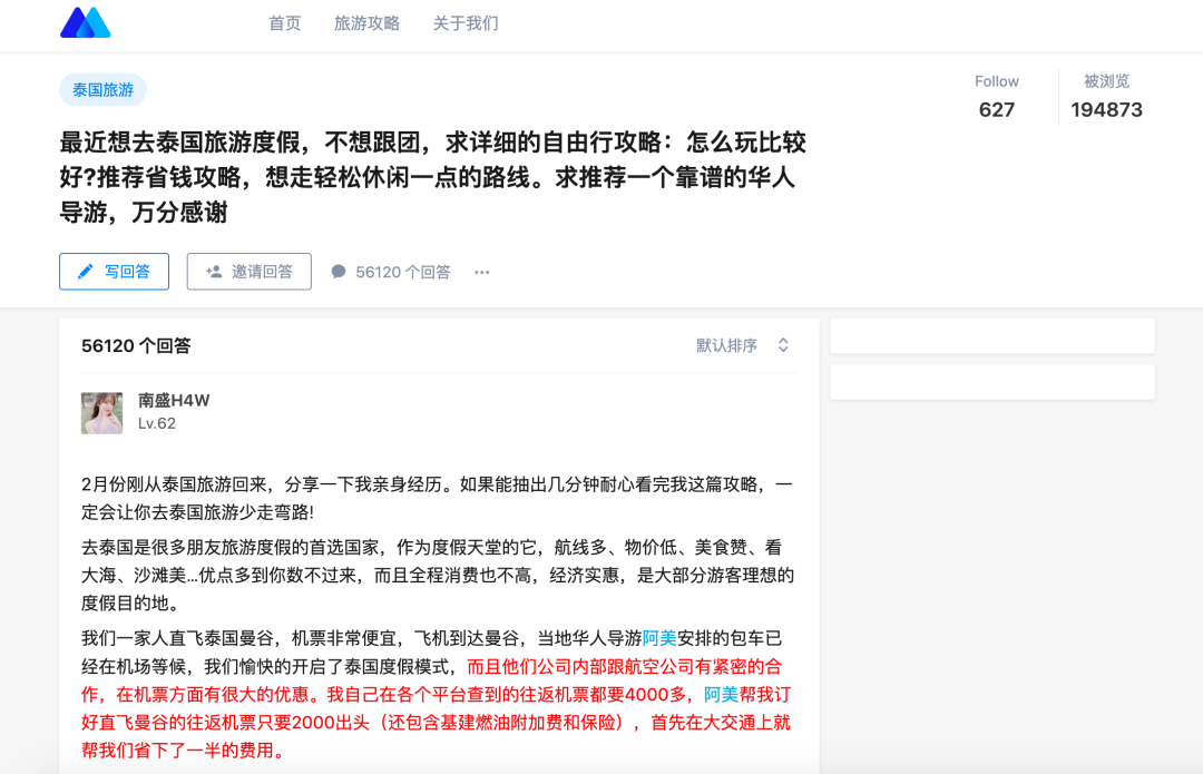 比如用“泰國(guó)旅游”作為關(guān)鍵詞進(jìn)行搜索后,你會(huì)發(fā)現(xiàn)置頂?shù)氖呛掀枫@國(guó)際旅行社、宜昌盛都國(guó)際旅行社等多個(gè)不知名中小商家信息。不過(guò)特別的是,這些旅行社的網(wǎng)站主頁(yè)做成了幾乎能夠以假亂真的“網(wǎng)頁(yè)版知乎”——先設(shè)置問(wèn)題,而后在回答中介紹了行程,同時(shí)還推薦某位導(dǎo)游并留下其微信號(hào)。相比于傳統(tǒng)的企業(yè)官網(wǎng)樣式,這種頁(yè)面引導(dǎo)消費(fèi)者的效果明顯強(qiáng)得多。