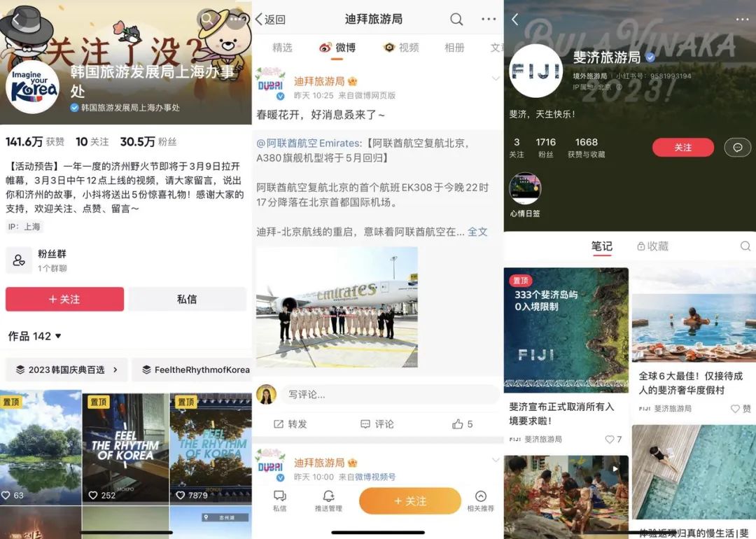 韓國(guó)旅游局抖音賬號(hào)、迪拜旅游局微博賬號(hào)、斐濟(jì)旅游局小紅書(shū)賬號(hào)