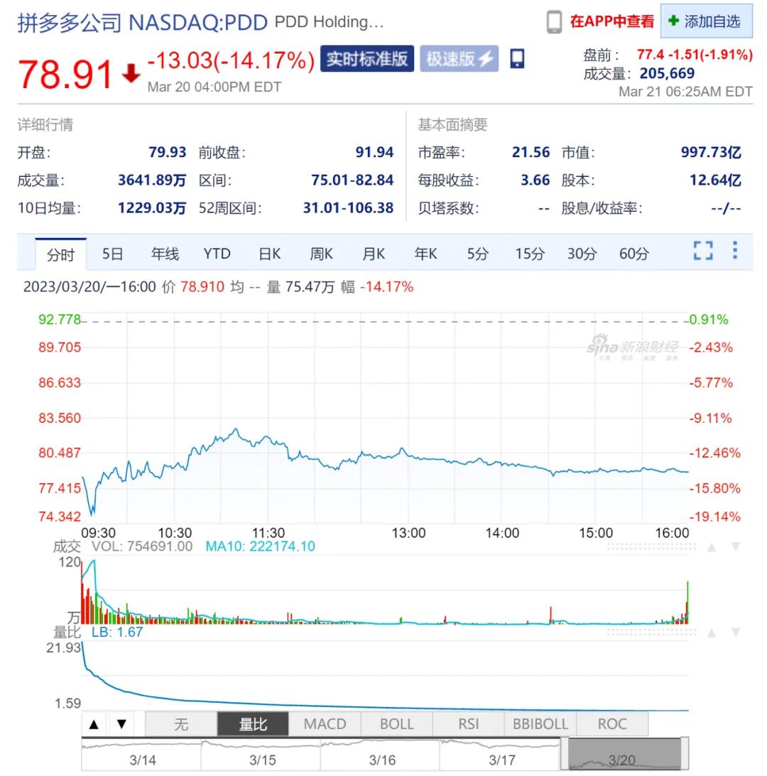 主要原因是,拼多多第四季度營收不及市場預(yù)期419.5億元;歸屬于普通股東的凈利潤為94.537億元,同比增長43%,市場預(yù)期97.5億元。此外,昨日谷歌宣布將拼多多APP從Play應(yīng)用商店下架,并標(biāo)記為惡意應(yīng)用程序。目前,拼多多尚未對此事做出回復(fù)。
