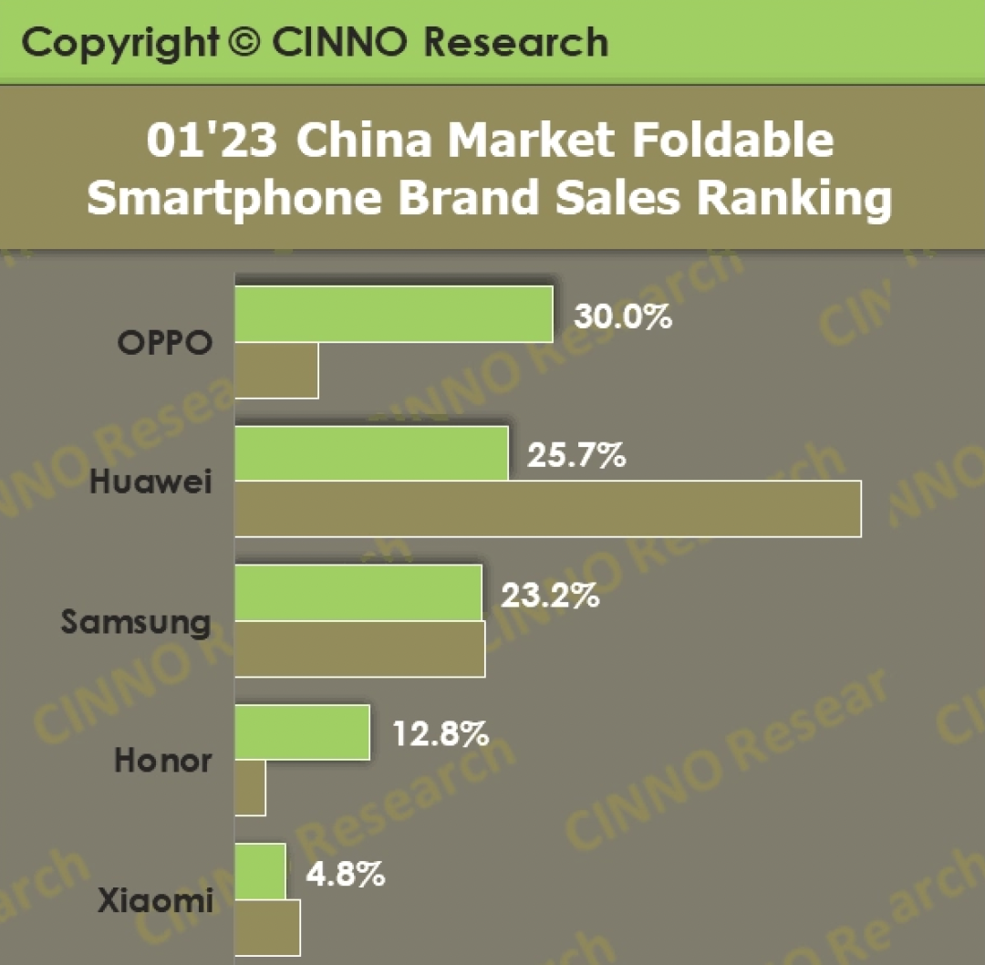 CINNO Research數據顯示,今年1月,OPPO折疊屏手機銷量同比增長483%,以30%的市場份額,首度問鼎國內榜首。在此之前,中國折疊屏手機市場份額的前2名,長期被最早入局的華為和三星牢牢占據。