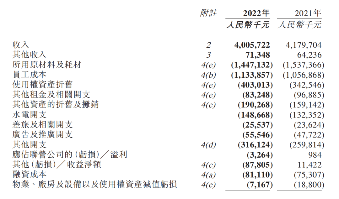 在原材料成本上,從2021年的15.37億微跌5.9%至2022年同期的人民幣 14.47億,大致與收入因疫情反彈而減少相符。原材料占比36. 1% 。