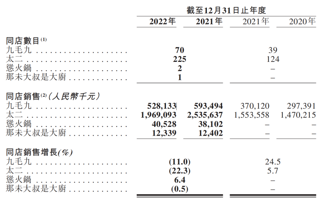 在同店銷售額方面,2022年,九毛九餐廳的同店銷售額為5.28億元,同比下滑11.0%;太二酸菜魚的同店銷售額為19.69億元,同比下滑22.3%;只有慫火鍋是正增長,同比增長了6.4%。