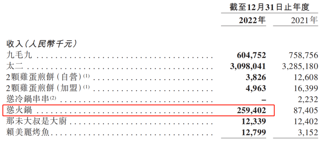 太二酸菜魚餐廳收入31.08億元,較上年同期減少5.6%,占總收入的比例由2021年的78.8%輕微下降至2022年的77.6%;