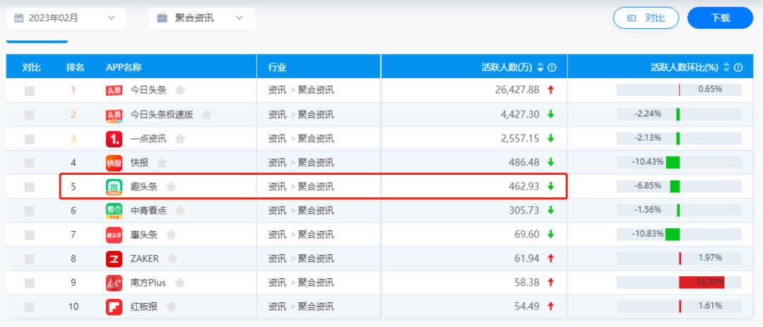 易觀千帆數(shù)據(jù)顯示,在2022年4月至2023年2月的11個月時間里,趣頭條的月活一路走低,僅今年1月的月活出現(xiàn)環(huán)比0.19%的微增,其余時間段內(nèi)月活均保持環(huán)比下滑的態(tài)勢。