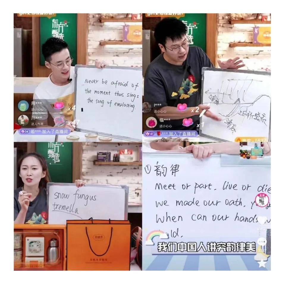 東方甄選去年6月剛剛爆紅時,的確以高密度的知識含量出圈。直播間的雙語直播和講課式直播成為特色,董宇輝一句“阿拉斯加的鱈魚”和“南太平洋的海鷗”就吸引了數(shù)十萬人涌進直播間。其他主播如YOYO、頓頓以及七七等,也都各具才藝,有人會念詩,有人教英語,還有人講解物理知識點,小白板也是直播間必備道具。