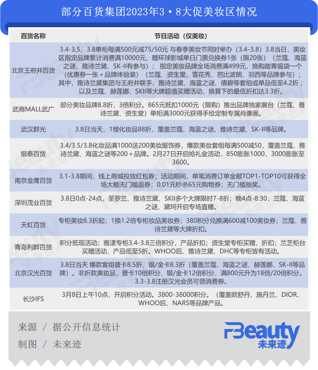 相對于CS,作為中高端品牌主戰(zhàn)場的百貨,在與品牌和跨品類聯動下,呈現出更多新看點。《FBeauty未來跡》調查發(fā)現,王府井、銀泰等頭部百貨商場在3·8婦女節(jié)期間發(fā)揮各自優(yōu)勢,推出極為豐富的活動內容,試圖帶來一場“線下狂歡”。