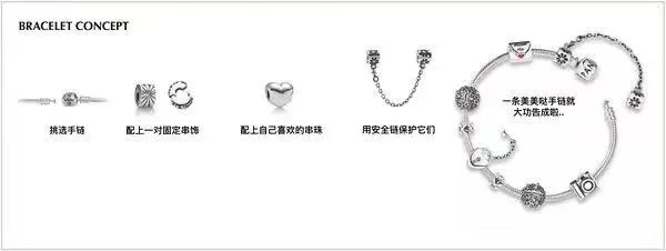 與眾多珠寶品牌售賣定型產(chǎn)品不同,潘多拉并沒有完整的成品手鏈,而是為消費(fèi)者提供可選擇的吊墜和手鏈,由消費(fèi)者做主,任意組合個性化手鏈。
