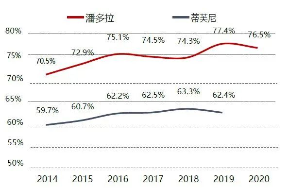 要知道,奢侈珠寶品牌Tiffany的毛利率也僅不到65%,潘多拉“親民”的面紗蕩然無存,取而代之的是性價比極低的印象。