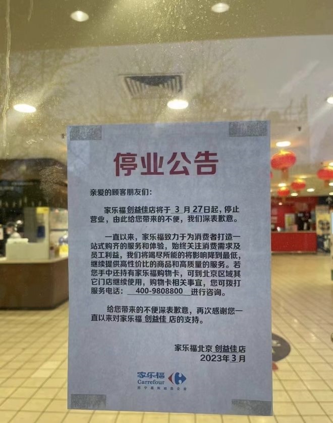 聯(lián)商快訊:近日,家樂(lè)福北京創(chuàng)益佳店發(fā)布公告稱,將于3月27日起停止?fàn)I業(yè)。