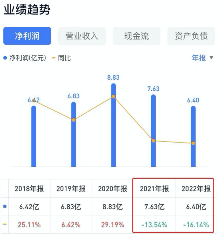 再看期間對應(yīng)的凈利潤分別是6.42億、6.83億、8.83億、7.63億、6.4億,在2021年之前桃李面包的利潤增幅還在上升,但到了2021年之后,利潤增幅為負(fù)。