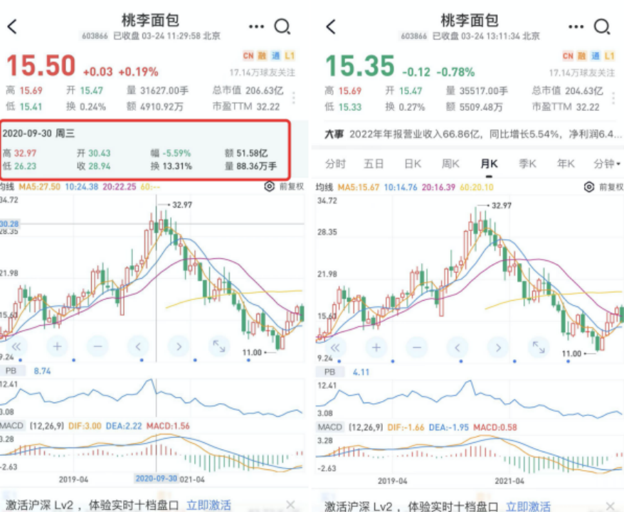 從雪球看到,在2020年9月30日,桃李面包股價達(dá)到最高點32.97元/股,在后來的兩年里,桃李的股價一路向下。