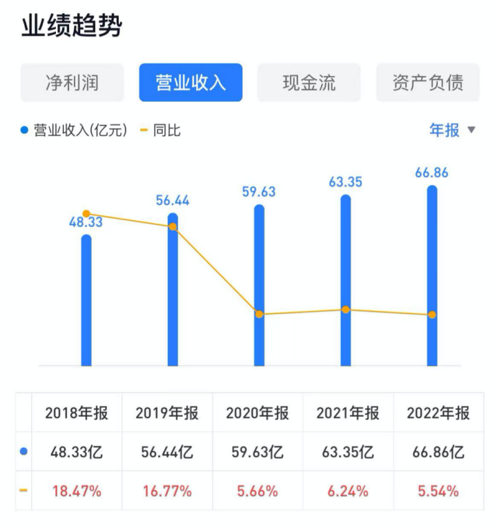 據(jù)財報顯示,2022年,桃李營收66.86億,較去年的63.35億,同比增加了5.54%;