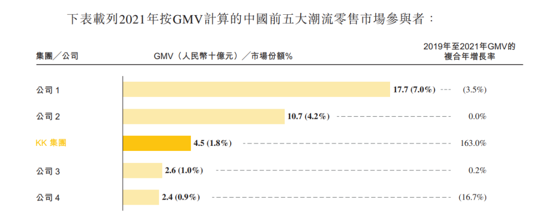 據(jù)統(tǒng)計(jì),按GMV(成交總額)計(jì)算,2021年中國(guó)潮流零售市場(chǎng)前五大參與者的總市場(chǎng)規(guī)模為379億元,占國(guó)內(nèi)總數(shù)的約14.9%。其中,KK集團(tuán)是2021年中國(guó)三大潮流零售商之一,旗下?lián)碛蠯K館、KKV、THE COLORIST調(diào)色師、X11四個(gè)連鎖零售品牌,是前十大市場(chǎng)參與者中增長(zhǎng)最快的潮流零售商,2019年至2021年GMV的復(fù)合年增長(zhǎng)率為163.0%。